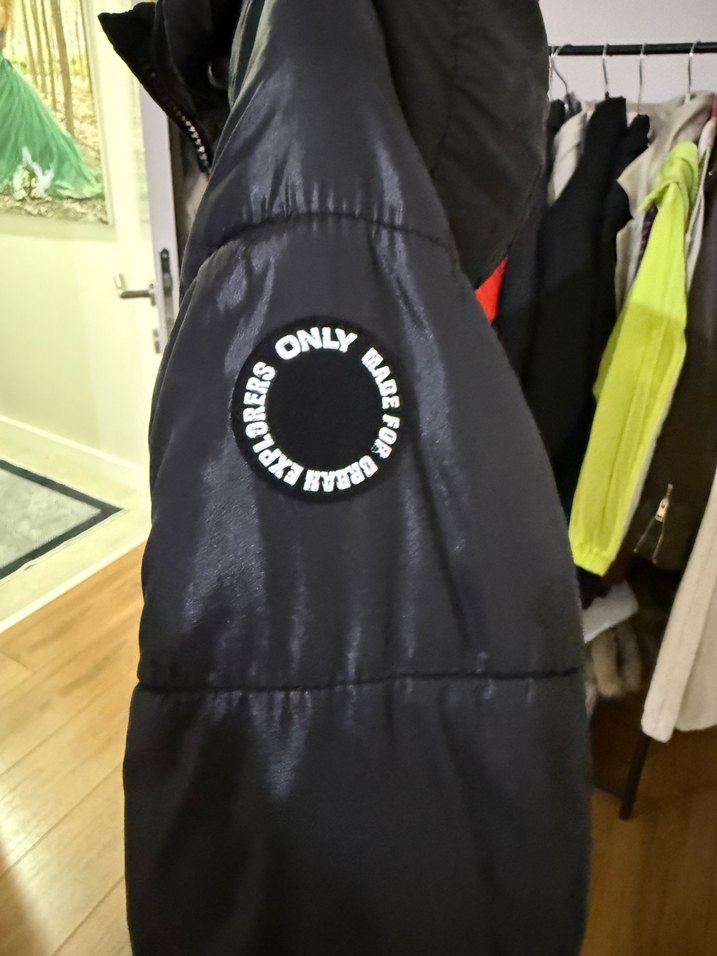 Kemerli, baskılı, siyah, midi uzunlukta, dar kesim street wear çocuk ceket. Bisiklet yaka ve askılı kollara sahiptir.