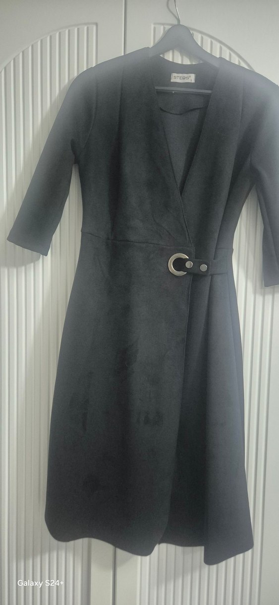 Kemerli ve notched lapel yakalı, siyah süet kumaştan yapılmış klasik ve şık diz boyu kadın Elbise Ofis için uygun, yarım kollu ve dar kesimdir.