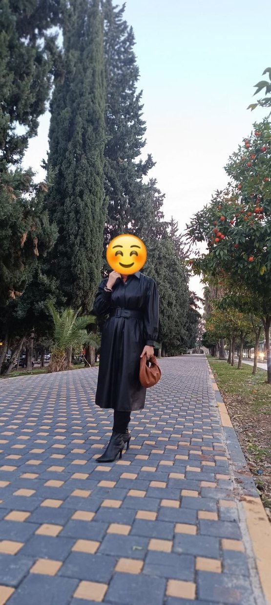 Yüksek yakalı ve uzun kollu, kemerli, bol kesim siyah uzun deri , hafif tie-dye deseniyle detaylandırılmış. 38-40 uyumlu