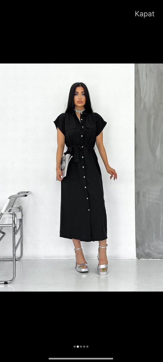 Kısa kollu, yakalı ve kemerli siyah uzun elbise. Parlak görünümlü, regular fit ve ofis ile sokak tarzı için uygun. s beden sıfır