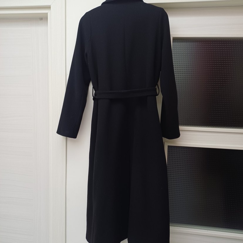Kemerli siyah uzun hamile kabanı, kesik yakalı ve uzun kolludur. Rahat oturan kesimi ve yumuşak, sıcak kumaşı ofis ortamına uygundur.