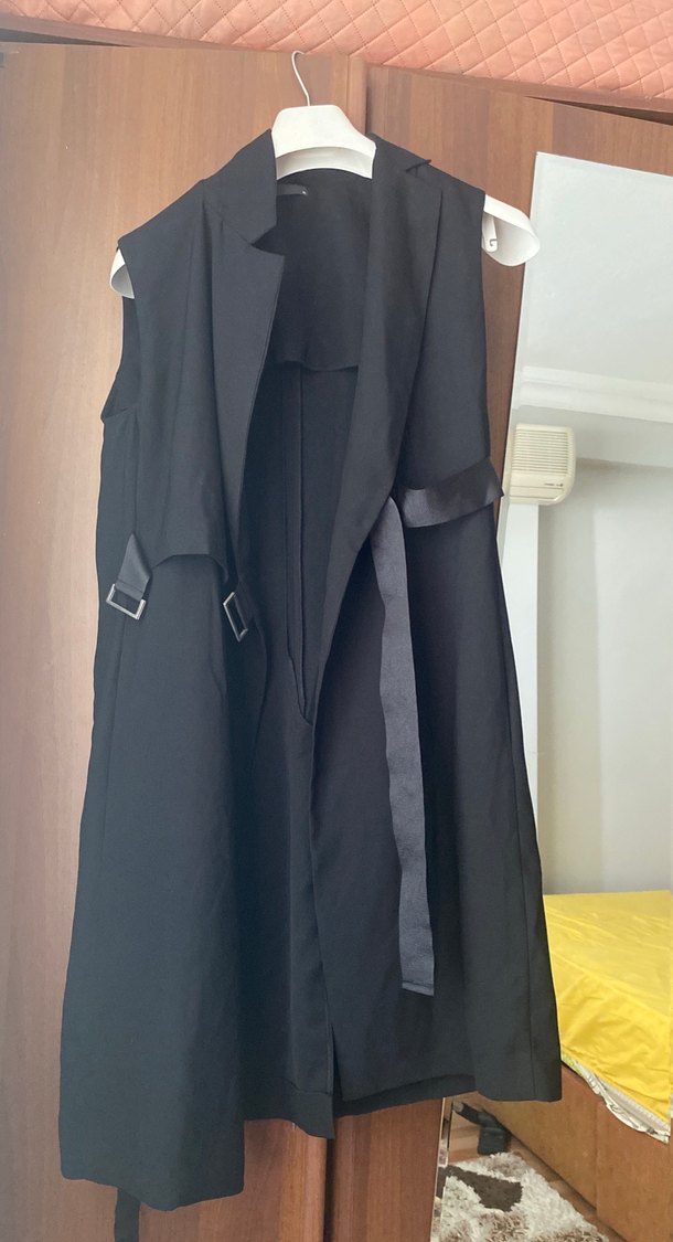 Kemerli bel ve yakalı, siyah uzun hamile yeleği, iş ortamı için uygun, koyu sentetik kumaştan ve regular kesim.