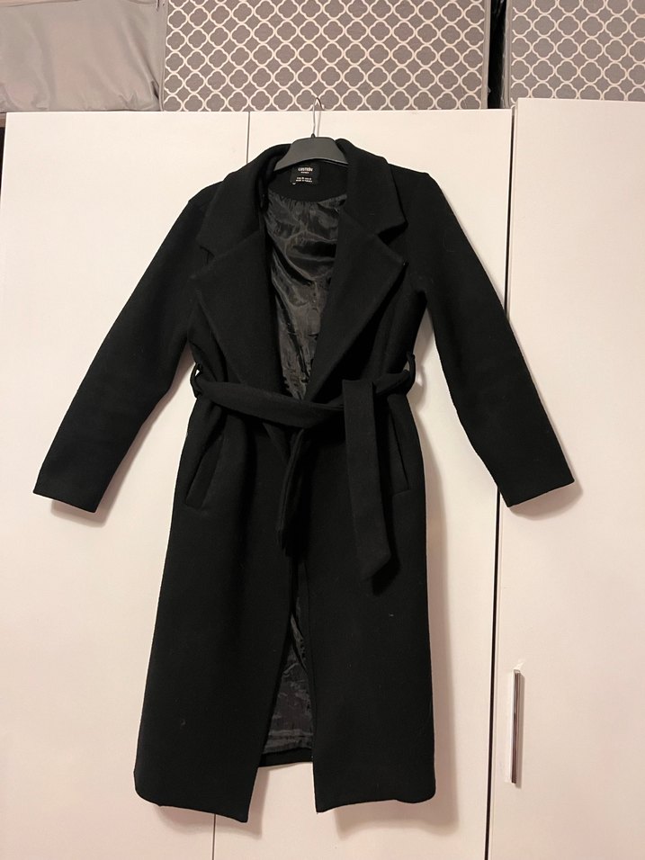 Kemerli bel ve yumuşak astar içeren uzun siyah kaban. Klasik yakalı ve şık tasarıma sahiptir.