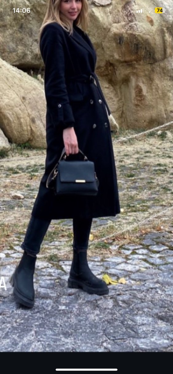 Kemerli ve düğmeli manşetli siyah uzun kaban, klasik ve şık bir görünüm sunar. Cepli ve yumuşak astarlıdır.Tüy toplama makinesi ile temizliğe bölgesel ihtiyacı var böyle de giyilebilir sıcak tutuyor artık giymediğim için satıyorum