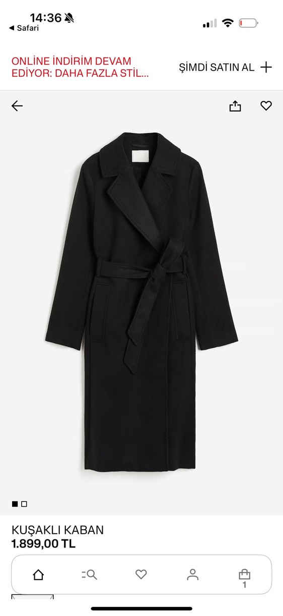 Kemerli ve klasik yakalı siyah uzun kaban, şık ve sıcak tutan bir tasarıma sahiptir.