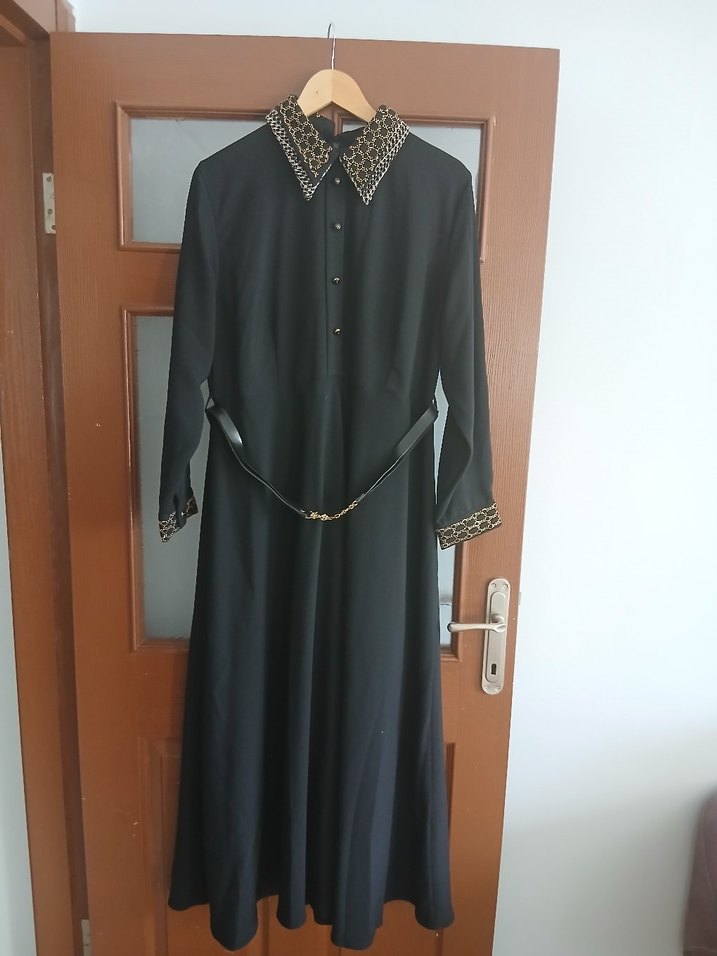 Kemerli, yakası desenli siyah uzun elbise