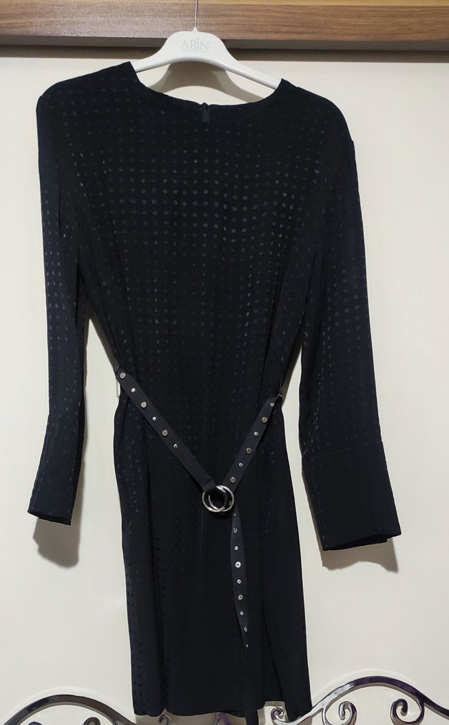 Kemerli, uzun ve dar kesim siyah elbise, yuvarlak yaka ve uzun kolludur. Pürüzsüz sentetik kumaştan olup, günlük kullanıma uygundur.