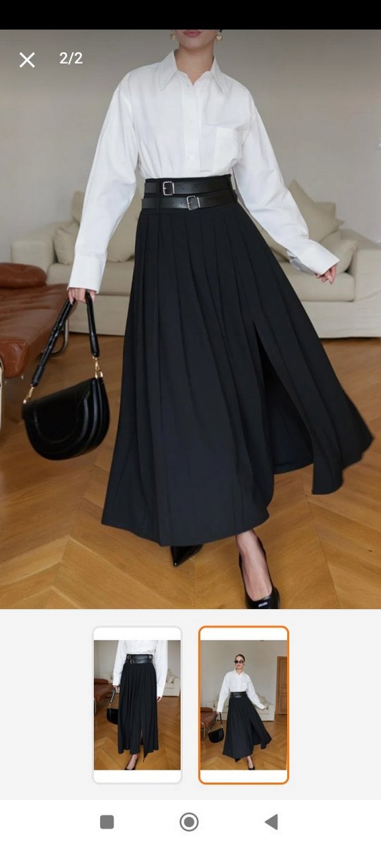 Kemerli bel ve bol kesimiyle siyah uzun etek, düz ve desen içermeyen yapısıyla klasik, gotik Paris tarzını yansıtıyor. yandan yırtmaçlı