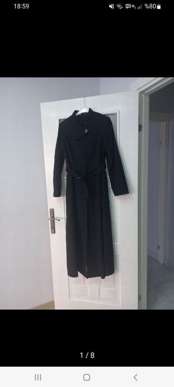 sadece 1 kez kullanildi uzun sevmedigim icin kullanmadim Kemerli bel ve yaka detaylı siyah uzun kaban, yumuşak ve sıcak dokusuyla klasik şıklık sunar. Ofis için uygun, regular fit ve uzun kolludur.
