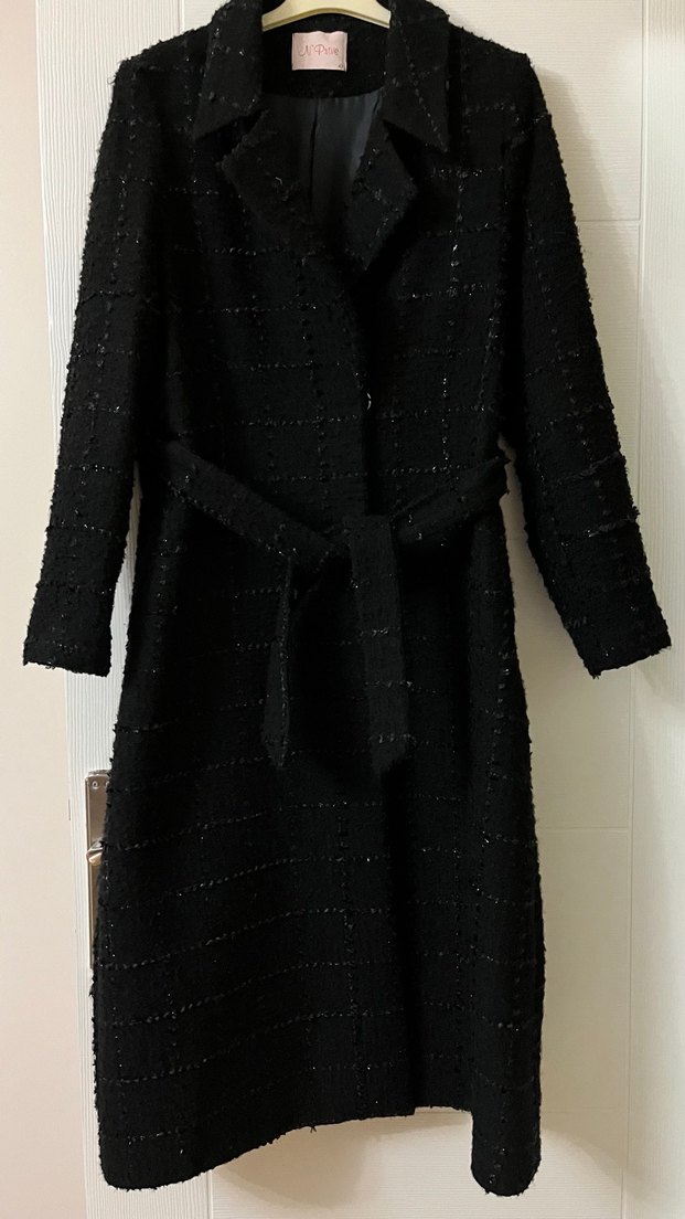 Kemerli siyah uzun kadın kaban, yakalı. şık bir kaban