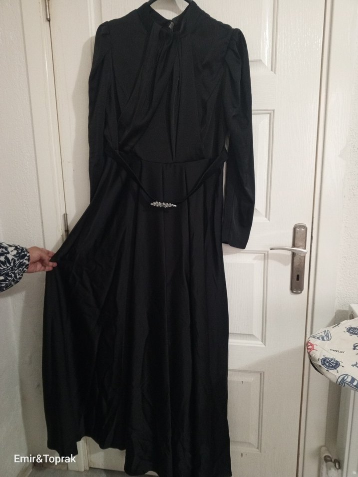 Saten kumaştan, kemerli ve uzun kollu, yüksek yakalı siyah uzun elbise. 1 kez giyildi hiçbir kusuru yoktur