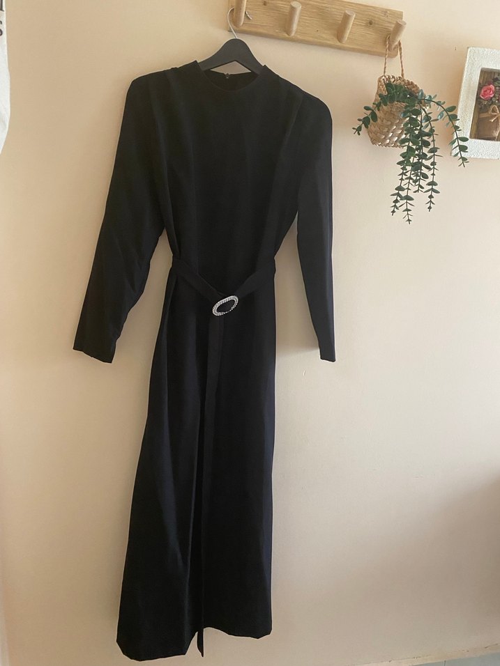 Kemerli, yüksek yakalı ve uzun kollu siyah uzun elbise, yumuşak ve sıcak kumaştan üretilmiştir. Klasik zarafet sunar ve günlük kullanım için uygundur.