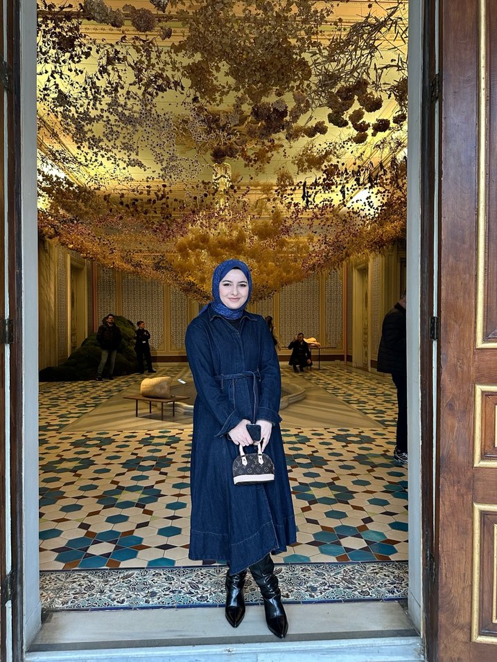 Kemerli, uzun kollu, siyah kot elbise, etnik desenler ve kesik yaka detaylarıyla günlük sokak stili için uygundur.