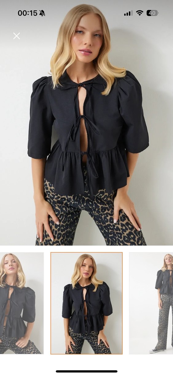 Kemerli, V yakalı ve kısa boylu siyah bluz, hafif kabarık kollu ve dar kesimlidir. Sokak tarzına uygun, günlük kullanıma uygundur.