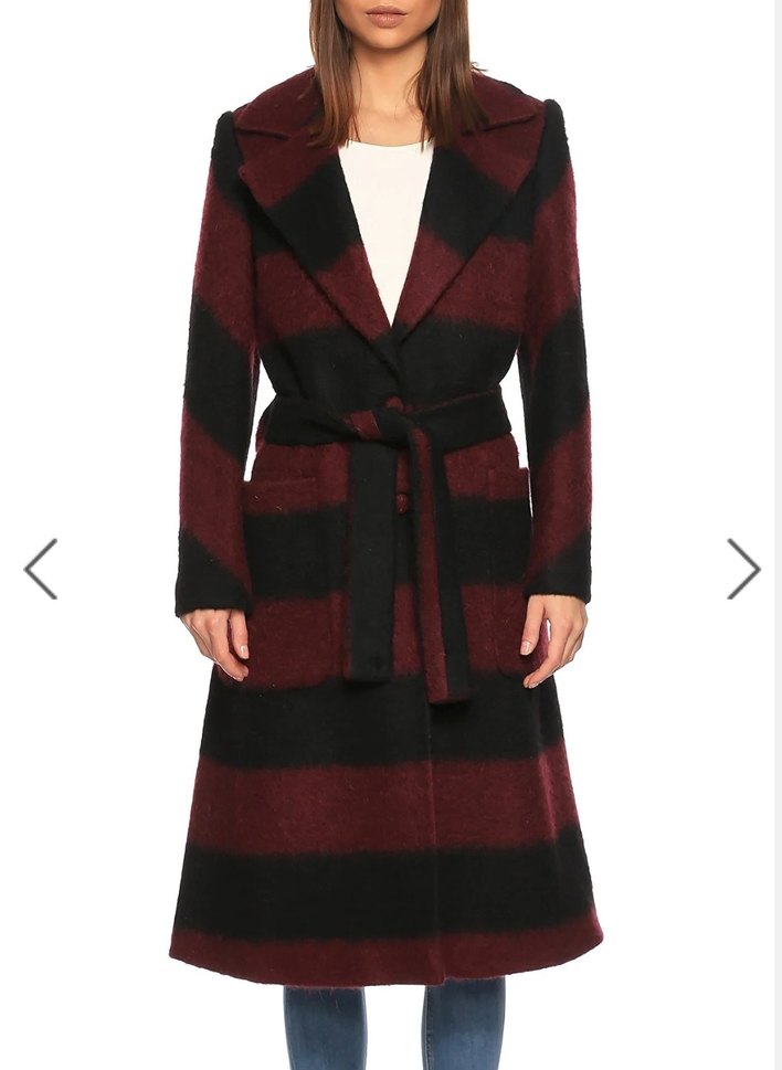 Çok az kullanılmış tertemiz M 38 beden,kemerli, cepli kadın kaban......Geniş siyah ve bordo çizgiler, belde kemer ve yumuşak sıcak kumaş ile klasik yakalı kaban.