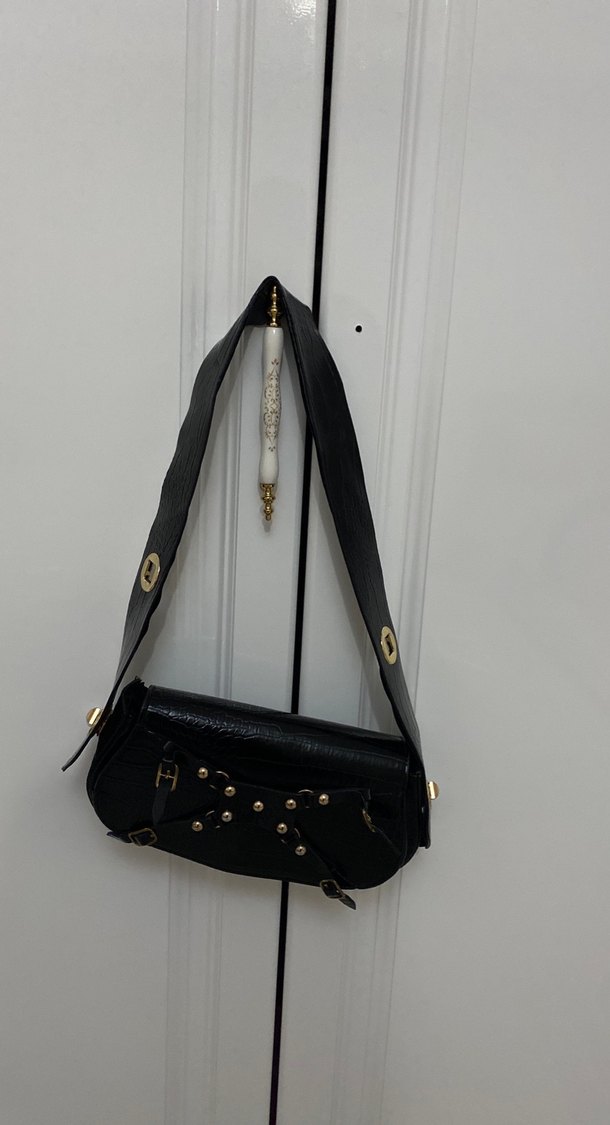 Kemerli detaylara ve yılan derisi desenine sahip siyah deri çanta, günlük kullanıma uygun gotik tarzda.