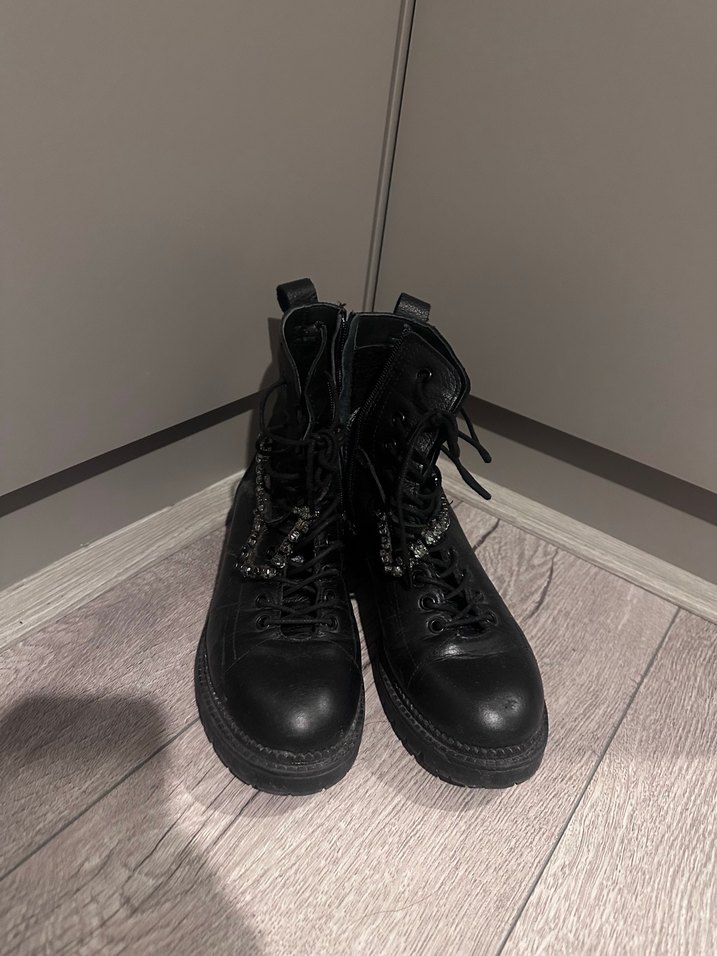 Kemer detaylı, yılan desenli siyah deri botlar, blok topuklu ve günlük kullanıma uygun rock punk tarzında. Çok temiz sıfır ayarında
