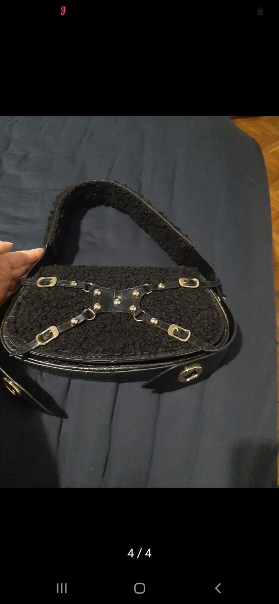 Yılan desenli siyah deri çanta, kemerli ve gotik tarzda, dokulu saplı. Günlük kullanıma uygun şık bir seçim.