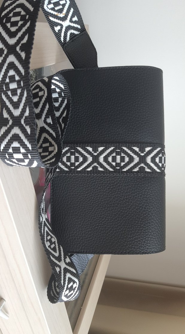 Kemerli, yılan desenli siyah deri çanta, siyah beyaz geometrik desenli kayışla bohem sokak stiline uygun. ayrıca düz siyah sayıda var hiç kullanilmamis