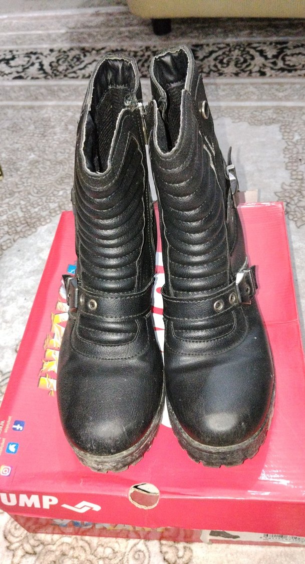 Bu siyah biker botlar yüksek topuklu ve kemerli kayışlara sahip, dayanıklı kauçuk malzemeden yapılmıştır. Rock punk havası verir, günlük kullanım için uygundur.
