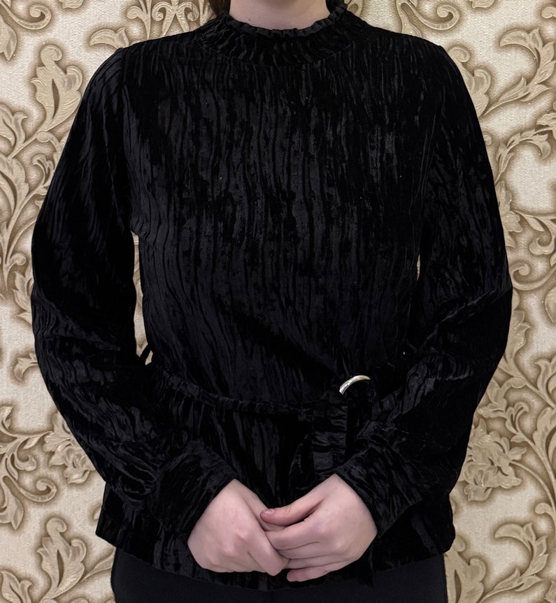 Kemerli, yüksek yakalı ve uzun kollu siyah bluz, yumuşak sentetik kumaştan yapılmıştır. Gotik tarzda, ofis kullanımı için uygundur.