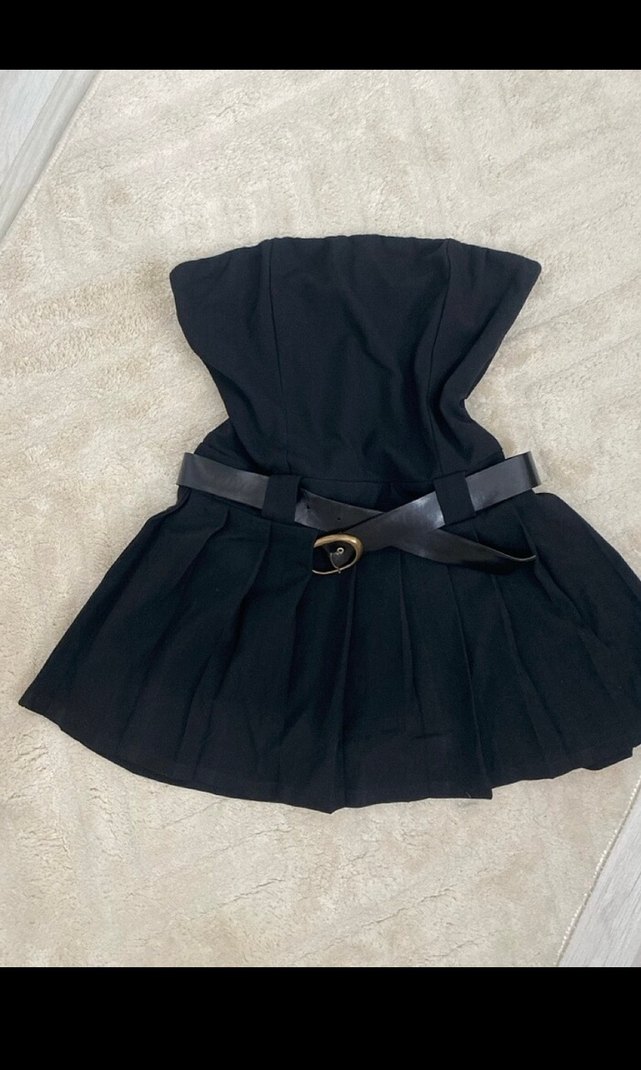 Kemerli, straplez yakalı siyah mini elbise, vücuda oturan kesimiyle gotik tarzda. Düz, sentetik kumaştan yapılmıştır ve günlük kullanıma uygundur.