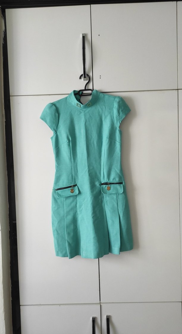 Yumuşak keten kumaştan turkuaz midi elbise, kemerli ve dar kesim. Kısa kollu, yüksek yakalı, fermuarlı iki ön cep bulunur.