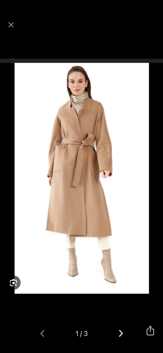 Kemerli ve büyük cepli uzun bej kaban, rahat ve şık bir kullanım sunar. Yaka ve uzun kolludur, ekstra sıcaklık sağlar.