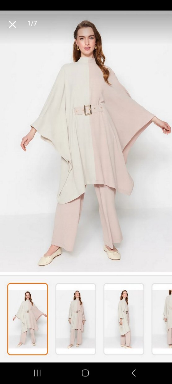 Kemer detaylı, yüksek yakalı ve askılı kolları olan, pastel bej renkli bol kesim tunik. Yumuşak sentetik kumaştan üretilmiştir.