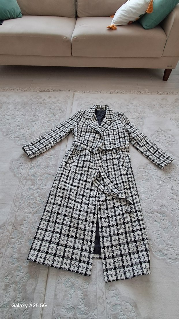 Kemerli, uzun, ekose desenli kadin kaban. Gri tonlarda, sentetik kumaştan, normal kesim ve uzun kollu. Klasik zarafet ve Paris sokak modasını bir arada sunar. özel dikimdir .