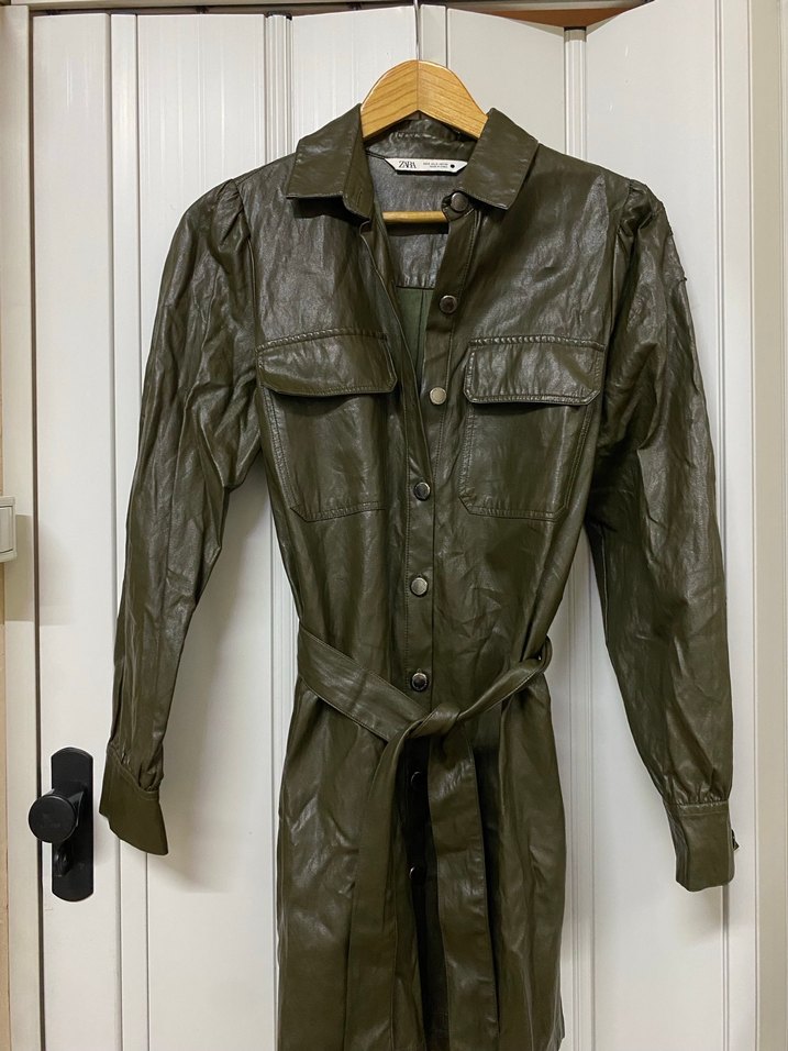 Kemerli, uzun kollu, uzun haki deri ceket. fitted kesimle günlük sokak stiline uygun.