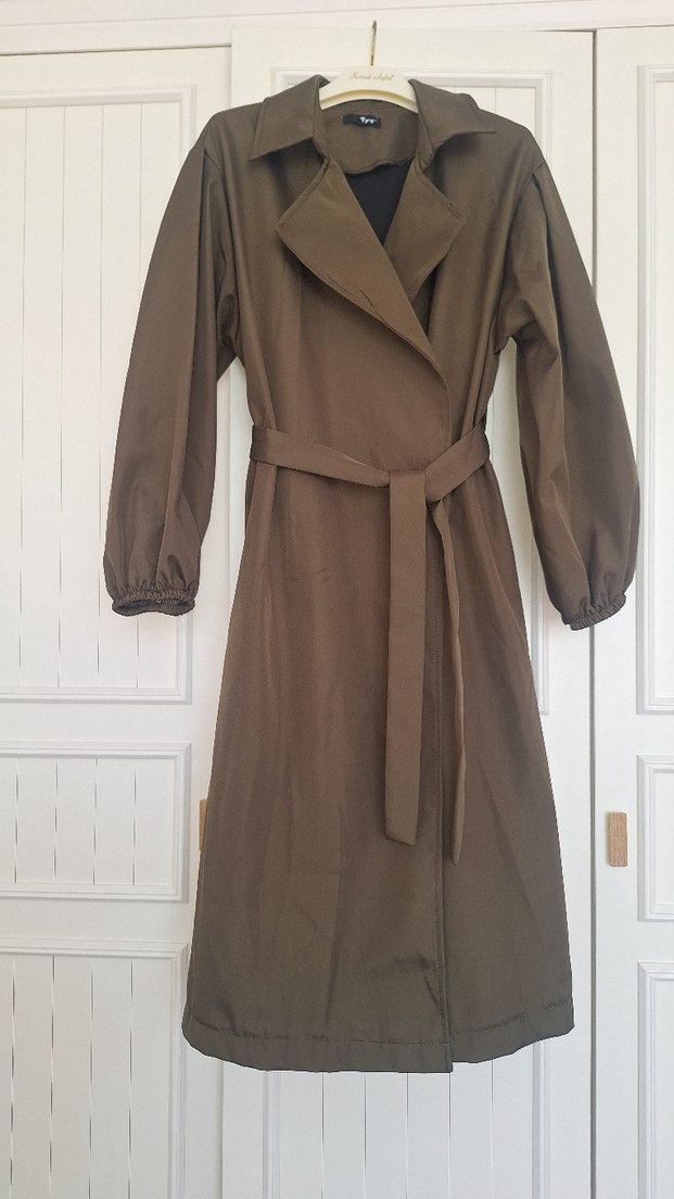 Kemerli ve yakası kırmalı uzun haki trençkot. Sentetik kumaştan, uzun kollu ve bol kesimdir. Sokak modasına uygun şık bir parça.