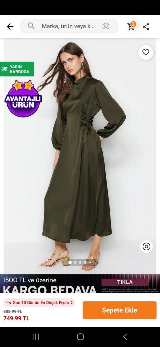 Kemerli, uzun ve bol kesim kadın elbisesi, yüksek yakalı ve uzun kolludur. Parlak haki renkli ipeksi kumaştan üretilmiştir. Minimalist sokak stili için uygundur.