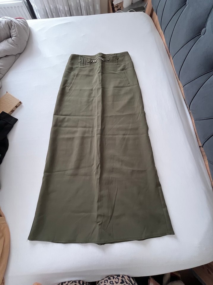 Haki renkte, kemerli ve düz kesime sahip uzun kadın eteği. Sentetik kumaştan üretilmiş, minimal ve desensiz tasarımıyla günlük kullanıma uygundur.