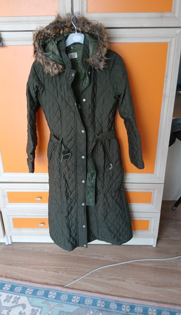 Kemerli, uzun, kadın kışlık mont. Sentetik kumaştan, koyu kahverengi, düz desenli ve rahat kesim. Notch yakalı, uzun kollu, günlük sokak stiline uygun.