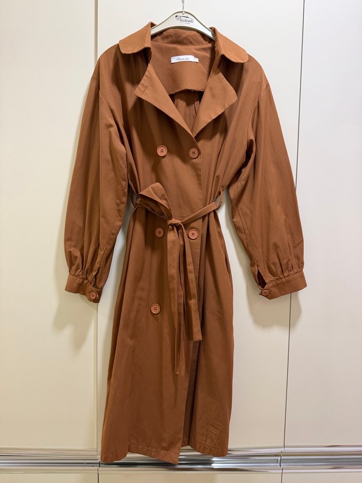 Uzun, kemerli kiremit renk trençkot; yakası kesimli, uzun ve bantlı kollu, bol kesim. Trendy ve rahat bir görünüm sağlar. Sentetik kumaştan üretilmiştir.