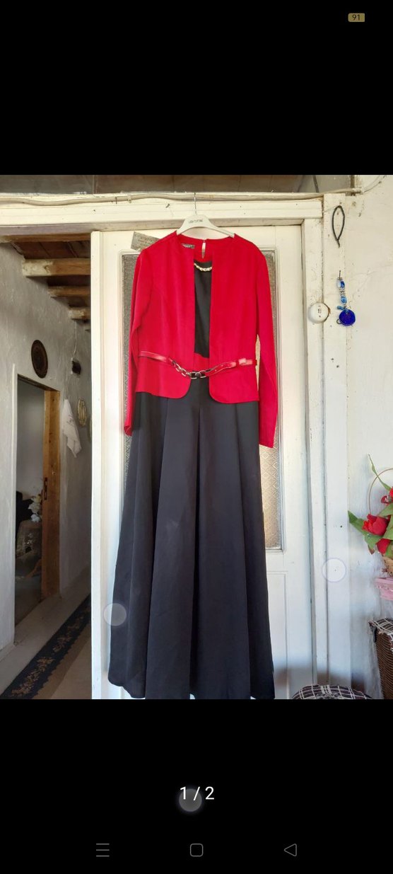 Kemerli kırmızı ceket ve siyah uzun etekten oluşan kadın elbisesi. Uzun kollu, klasik zarif ve gotik tarzda, ofis için uygun.