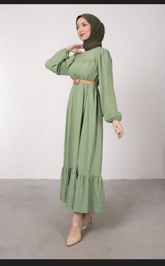 Kemerli, bol kesim, uzun kollu ve kayık yaka olan haki renk uzun elbise. Minimalist ve sade bohem tarzıyla günlük kullanıma uygundur.