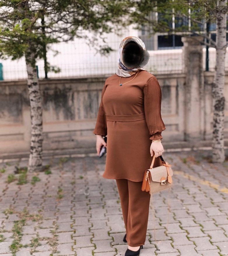 Kemerli bel, uzun kollu ve yüksek yakalı, kahverenginde sentetik kumaştan üretilmiş kadın takımı. Minimalist ve günlük kullanıma uygun.