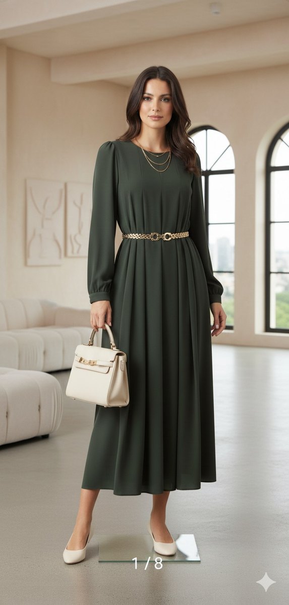 Kemerli bel, uzun kol ve yuvarlak yaka detaylarına sahip koyu haki uzun elbise, klasik ve modern kesimiyle ofis için uygundur.