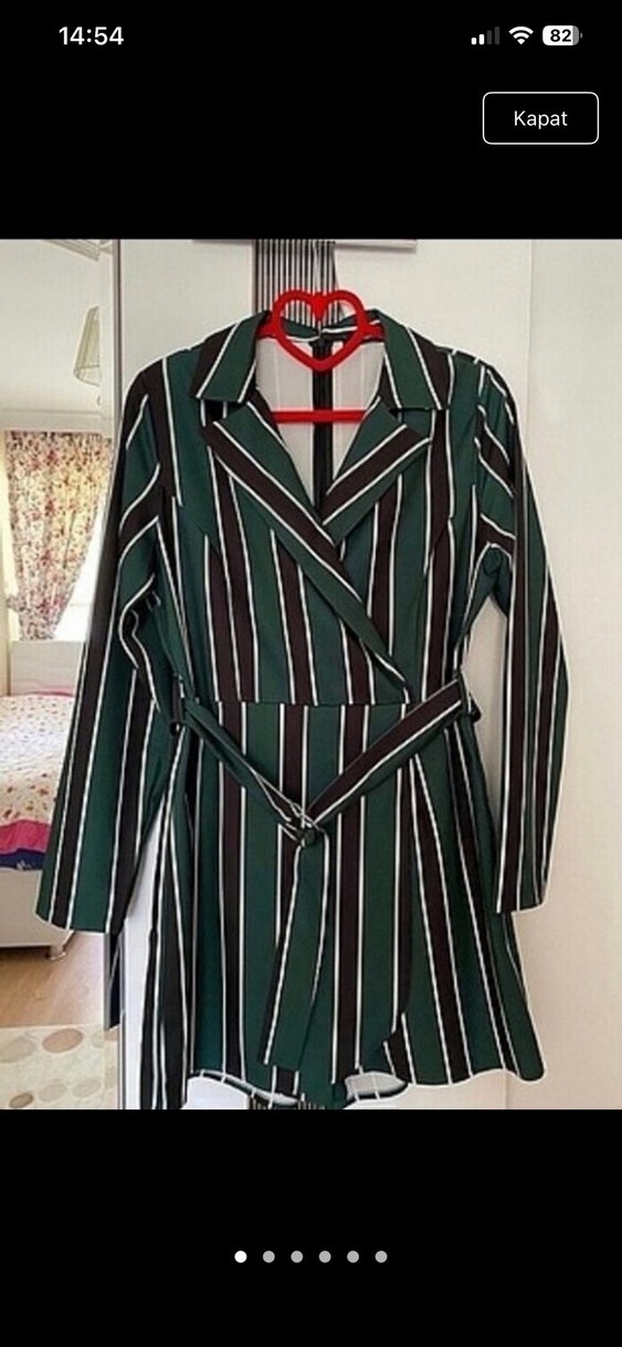 Kemerli, uzun kollu, notched lapel yakalı, koyu yeşil çizgili kadın takımı. Sentetik kumaştan, günlük kullanıma uygun, trend