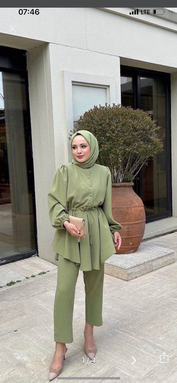 Kemerli, uzun kollu, yüksek yakalı kadın takımı, hafif sentetik kumaştan ve haki renkte. Etnik desenli, sade ve mütevazı stil için uygun. Hiçbir defosusu yok 1 kez giyildi