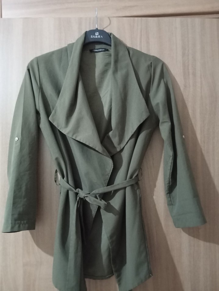 Kadınlar için kemerli, normal boy midi trençkot. Keten kumaştan, uzun kollu ve yakası kesik. Düz yeşil renkte, günlük kullanım için uygun.