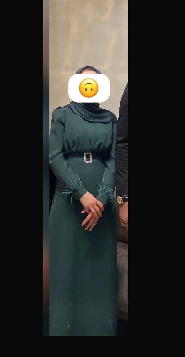 Kemerli, yüksek yakalı ve uzun kollu bu koyu yeşil abiye elbise, bileklerde tüy detaylarına sahiptir. İş ortamına uygundur. Sadece bir defa 2 saat giyildi