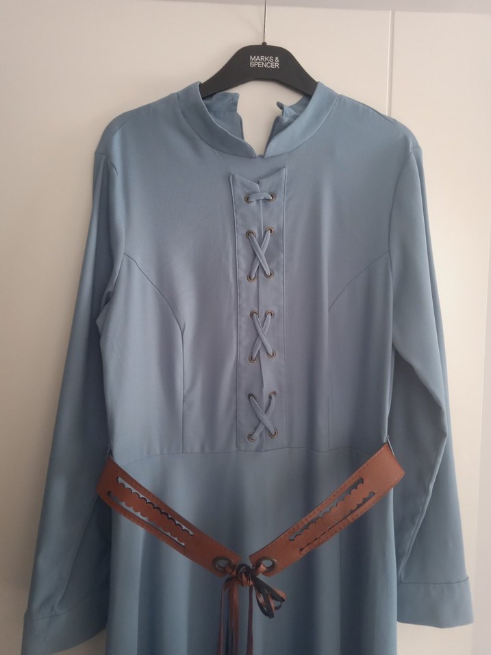 Kemerli beli ve yüksek yakası ile uzun kollu, klasik kesim uzun elbise. Yumuşak sentetik kumaştan, mavi tonunda, nakış detaylı vintage ve streetwear tarzında.