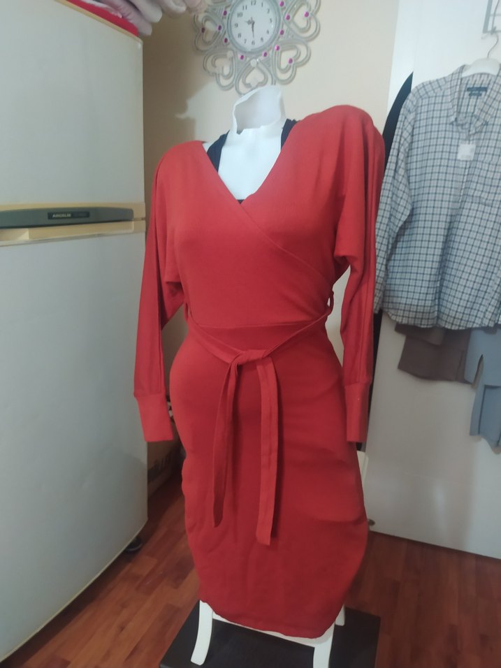 Yarasa kollu bel ölçüsü 34 cm boyu 98 cm Kemerli, V yaka ve uzun kollu bu triko elbise,