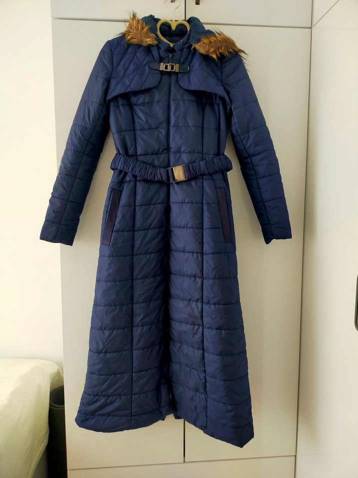Kemerli, uzun ve dar kesim kadın kışlık mont. Suni kürklü yakası ve koyu lacivert rengiyle sokak modasına uygun, günlük kullanıma ideal bir parça. bel 39 koltuk altı 42 boy 116 kol 58 cm çıkarılabilir kapüşon ölçülere bakıp ona göre alınız