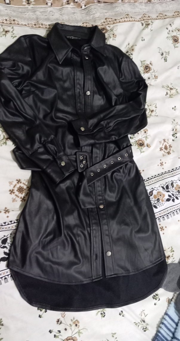 Kemerli, uzun siyah deri kadın ceket, yakalı ve askılı kollu, gotik stilde. Günlük kullanıma uygun, desen içermeyen şık tasarım. ürünün kolunda hasar var