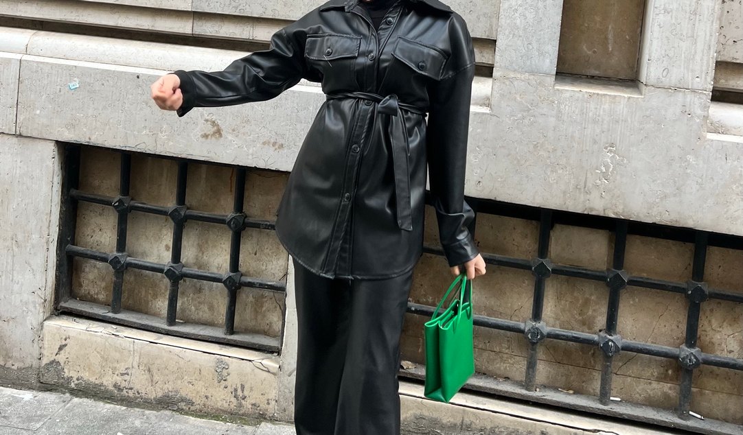 Kemerli bel, siyah deri ceket, günlük kullanım için uzun ve rahat