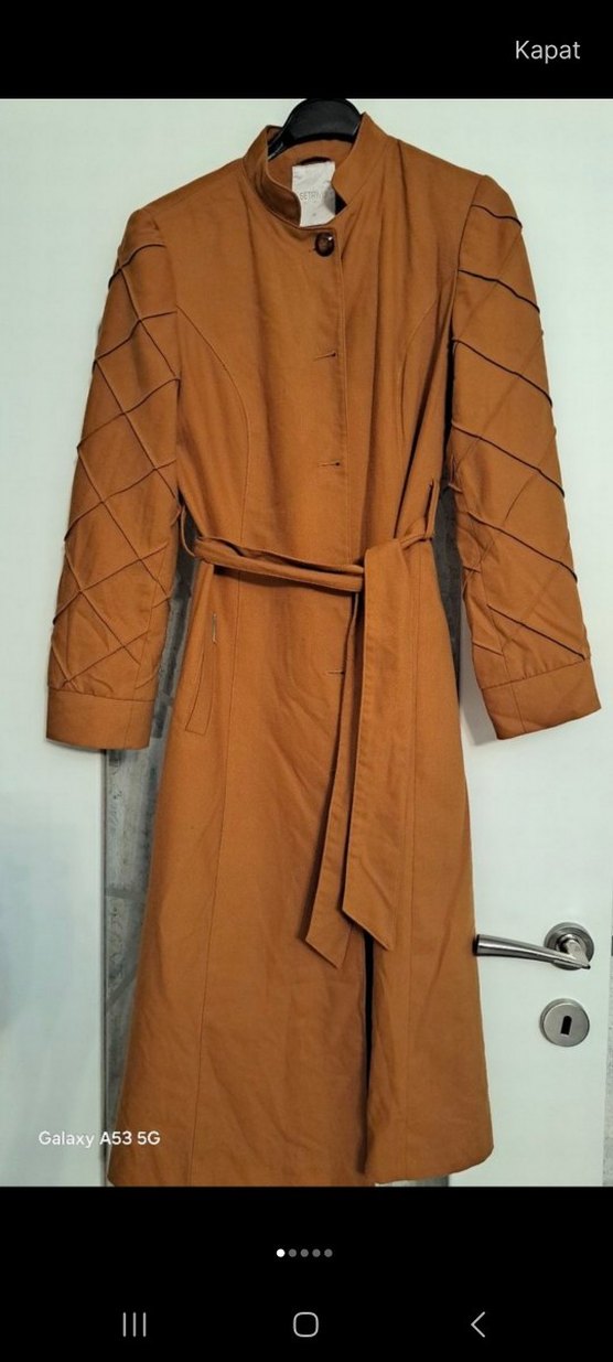 Kemerli bel ve uzun kesim ile bej renk süet trençkot. Notch yakalı ve strappy kollu, sokak modasına uygun avant-garde tarzda.